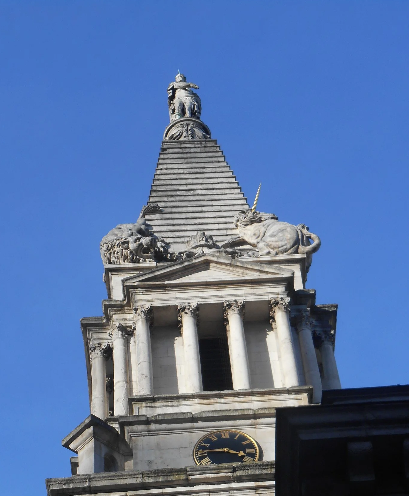 Also while walking in Bloomsbury I passed Nicholas Hawksmoor’s church of St. George, built between 1716 and 1731. The steeple is topped by a statue of George I and statues of the lion and unicorn (England and Scotland) are crouched around the steeple’s base. Just a reminder of how complex inheritance could be for this German prince to reign in Britain.